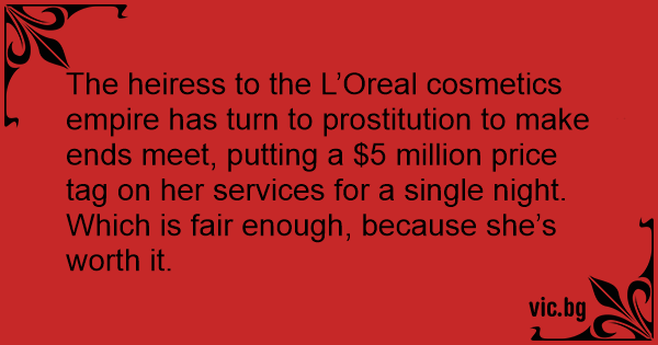 The heiress to the L’Oreal cosmetics empire has turn to prostitution to make ends meet, putting a $5 million price tag on her services for a single night.