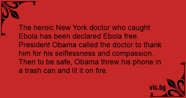 The heroic New York doctor who caught Ebola has been declared Ebola free. President Obama called the doctor to thank him for his selflessness and compassion. Then to be safe, Obama threw his phone in a trash can and lit it on fire.