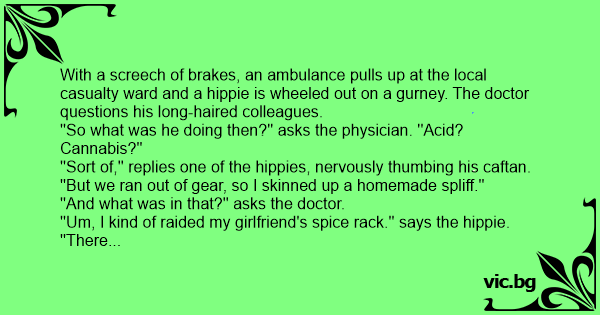 With a screech of brakes, an ambulance pulls up at the local casualty ward and a hippie is wheeled out on a gurney. The doctor questions his long-haired colleagues.