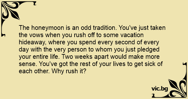 The honeymoon is an odd tradition. You've just taken the vows when you rush off to some vacation hideaway, where you spend every second of every day with the very person to whom you just pledged your entire life. Two weeks apart would make more sense. You've got the rest of your lives to get sick of each other. Why rush it?