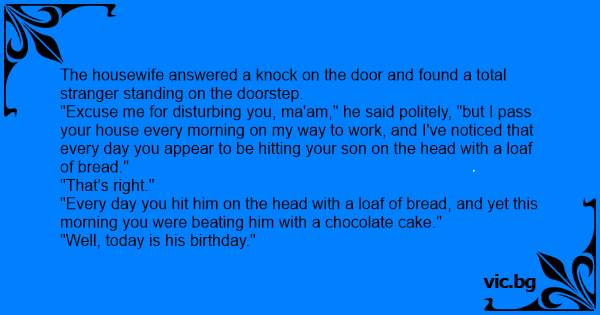 "Excuse me for disturbing you, ma'am," he said politely, "but I pass your house every morning on my way to work, and I've noticed that every day you appear to be hitting your son on the head with a loaf of bread."