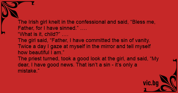 The girl said, “Father, I have committed the sin of vanity. Twice a day I gaze at myself in the mirror and tell myself how beautiful I am.”