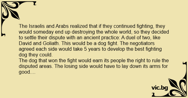 The Arabs approached the Israelis, muttering and shaking their heads in disbelief. “We do not understand,” said their leader, “our top scientists and breeders worked for 5 years with the meanest, biggest Dobermans, Rottweillers and Siberian wolves. They developed an incredible killing machine of a dog”.