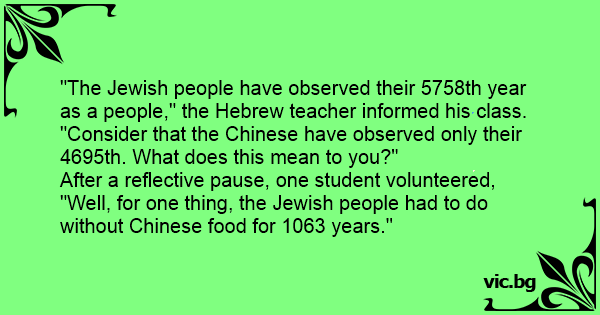 "The Jewish people have observed their 5758th year as a people," the Hebrew teacher informed his class. "Consider that the Chinese have observed only their 4695th. What does this mean to you?"