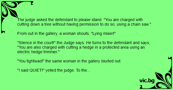 "Silence in the court!" the Judge says. He turns to the defendant and says, "You are also charged with cutting a hedge in a protected area using an electric hedge trimmer."