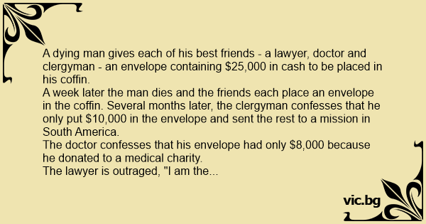 A week later the man dies and the friends each place an envelope in the coffin. Several months later, the clergyman confesses that he only put $10,000 in the envelope and sent the rest to a mission in South America.