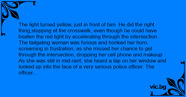 The tailgating woman was furious and honked her horn, screaming in frustration, as she missed her chance to get through the intersection, dropping her cell phone and makeup.