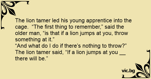 The lion tamer led his young apprentice into the cage. “The first thing to remember,” said the older man, “is that if a lion jumps at you, throw something at it.”