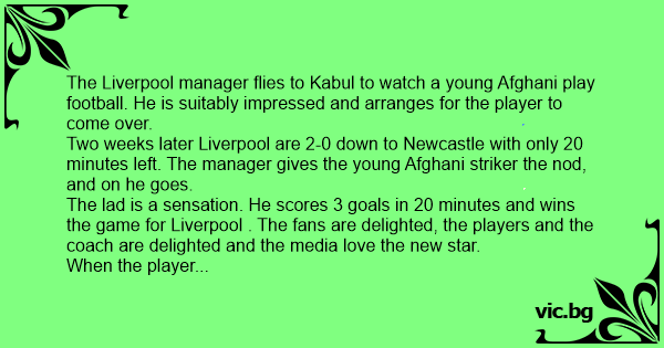 Two weeks later Liverpool are 2-0 down to Newcastle with only 20 minutes left. The manager gives the young Afghani striker the nod, and on he goes.