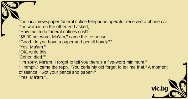 The local newspaper funeral notice telephone operator received a phone call. The woman on the other end asked,