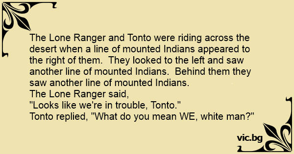 The Lone Ranger and Тоnто were riding across the desert when a line of mounted Indians appeared to the right of them. They looked to the left and saw another line of mounted Indians. Behind them they saw another line of mounted Indians.