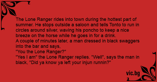 "Yes I am" the Lone Ranger replies. "Well", says the man in black, "Did ya know ya left your injun runnin?"