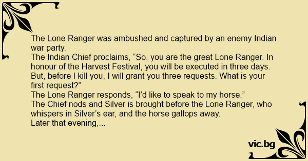 The Indian Chief proclaims, “So, you are the great Lone Ranger. In honour of the Harvest Festival, you will be executed in three days. But, before I кill you, I will grant you three requests. What is your first request?”