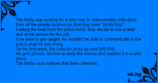 The deaf and dumb collector can't communicate with them, so the Mafia drags the guy to an interpreter.