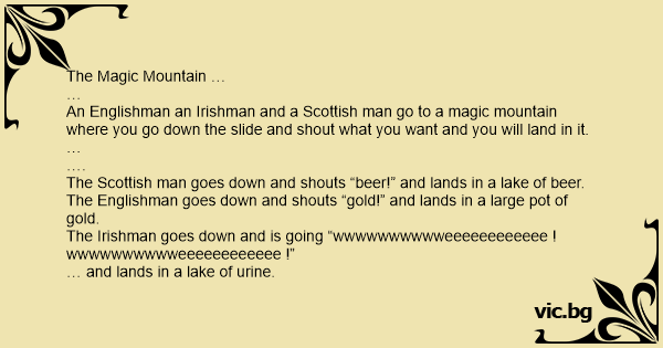 An Englishman an Irishman and a Scottish man go to a magic mountain where you go down the slide and shout what you want and you will land in it. …