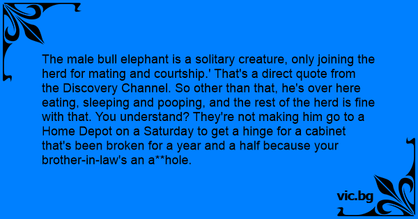 The male bull elephant is a solitary creature, only joining the herd for mating and courtship.' That's a direct quote from the Discovery Channel. So other than that, he's over here eating, sleeping and pooping, and the rest of the herd is fine with that. You understand? They're not making him go to a Home Depot on a Saturday to get a hinge for a cabinet that's been broken for a year and a half because your brother-in-law's an a**hole.
