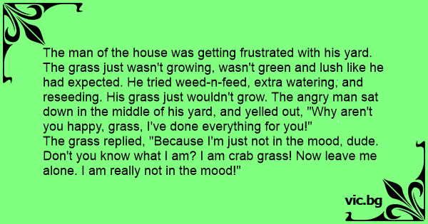 The grass replied, "Because I'm just not in the mood, dude. Don't you know what I am? I am crab grass! Now leave me alone. I am really not in the mood!"