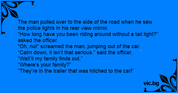 The man pulled over to the side of the road when he saw the police lights in his rear view mirror. “How long have you been riding around without a tail light?” asked the officer. “Oh, no!” screamed the man, jumping out of the car. “Calm down, it isn’t that serious.” said the officer. “Wait’ll my family finds out.” “Where’s your family?” “They’re in the trailer that was hitched to the car!”
