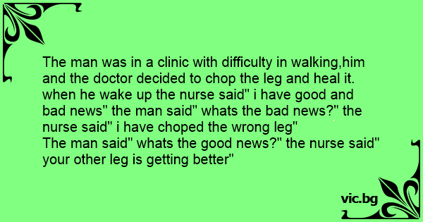 The man was in a clinic with difficulty in walking,him and the doctor decided to chop the leg and heal it. when he wake up the nurse said" i have good and bad news" the man said" whats the bad news?" the nurse said" i have choped the wrong leg"