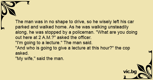 Полицаец застанува пијан маж и го прашува: - Каде сте тргнале толку доцна навечер? - На предавање. - Е како да не. Кој држи предавања во ова време?! - Жена ми!!
