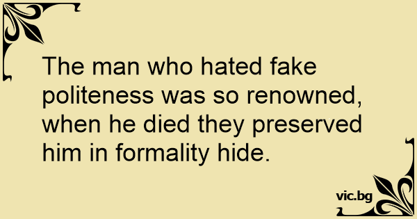The man who hated fake politeness was so renowned, when he died they preserved him in formality hide.