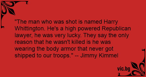 "The man who was shot is named Harry Whittington. He's a high powered Republican lawyer, he was very lucky. They say the only reason that he wasn't killed is he was wearing the body armor that never got shipped to our troops." -- Jimmy Kimmel