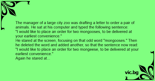 Again he stared at the screen, this time focusing on the new word, which seemed just as odd as the original one. Finally, he deleted the whole sentence and started all over. "Everyone knows no fully stocked zoo should be without a mongoose," he typed. "Please send us two of them."