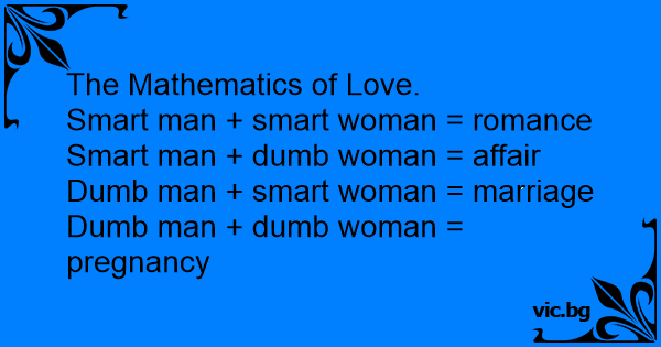 Romantische logica Slimme man + slimme vrouw = romance Slimme man + domme vrouw = affaire Domme man + slimme vrouw = huwelijk Domme man + domme vrouw = verwachten een baby Kantoorlogica...