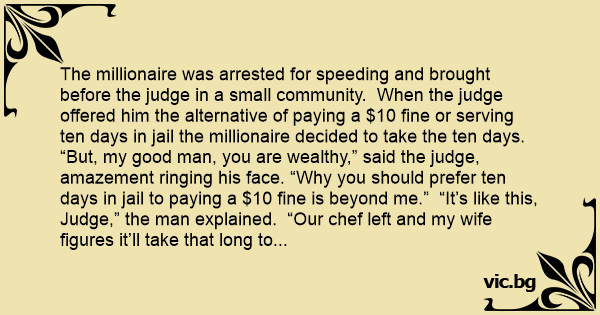 The millionaire was arrested for speeding and brought before the judge in a small community. When the judge offered him the alternative of paying a $10 fine or serving ten days in jail the millionaire decided to take the ten days. “But, my good man, you are wealthy,” said the judge, amazement ringing his face. “Why you should prefer ten days in jail to paying a $10 fine is beyond me.” “It’s like this, Judge,” the man explained. “Our chef left and my wife figures it’ll take that long to find a new one.”
