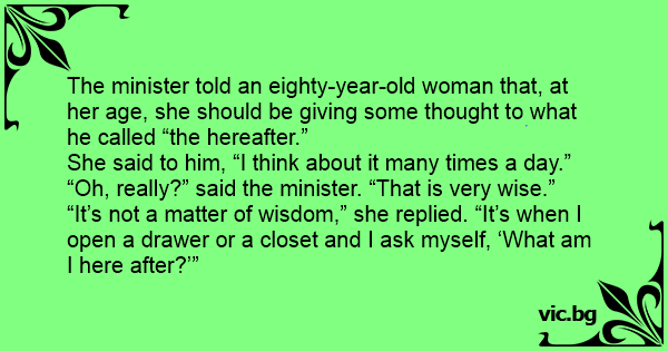 The minister told an eighty-year-old woman that, at her age, she should be giving some thought to what he called “the hereafter.”