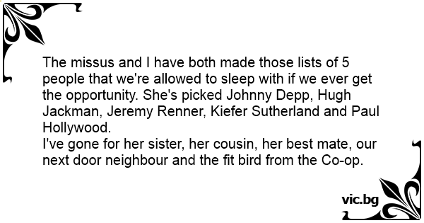 The missus and I have both made those lists of 5 people that we're allowed to sleep with if we ever get the opportunity. She's picked Johnny Dерр, Hugh Jackman, Jeremy Renner, Kiefer Sutherland and Paul Hollywood.