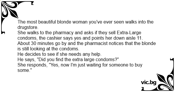 She walks to the pharmacy and asks if they sell Extra-Large condoms, the cashier says yes and points her down aisle 11.