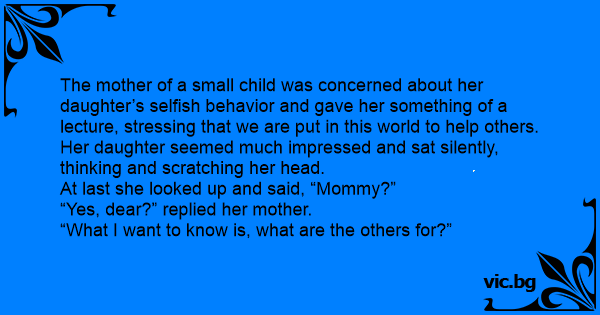 The mother of a small child was concerned about her daughter’s selfish behavior and gave her something of a lecture, stressing that we are put in this world to help others.