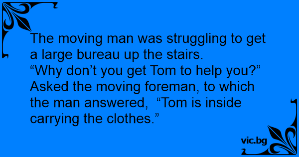 “Why don’t you get Tom to help you?” Asked the moving foreman, to which the man answered, “Tom is inside carrying the clothes.”