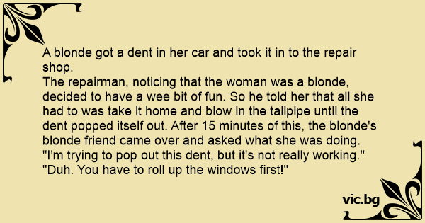 The repairman, noticing that the woman was a blonde, decided to have a wee bit of fun. So he told her that all she had to was take it home and вlоw in the tailpipe until the dent popped itself out. After 15 minutes of this, the blonde's blonde friend came over and asked what she was doing.