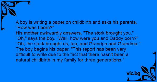 The boy begins his paper, "This report has been very difficult to write due to the fact that there hasn't been a natural childbirth in my family for three generations."