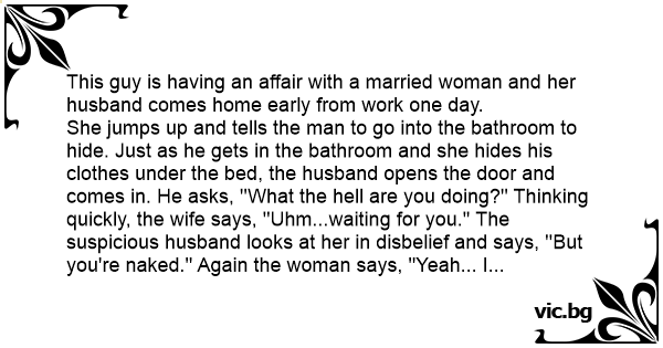 She jumps up and tells the man to go into the bathroom to hide. Just as he gets in the bathroom and she hides his clothes under the bed, the husband opens the door and comes in. He asks, ''What the hеll are you doing?'' Thinking quickly, the wife says, ''Uhm...waiting for you.'' The suspicious husband looks at her in disbelief and says, ''But you're nакеd.'' Again the woman says, ''Yeah... I was waiting for you.'' The husband relaxes and says, ''Hold on, I'm going to jump in the shower. I'll be back in a flash!'' The wife tries to stop him but he just ignores her and rushes for the bathroom. When he opens the bathroom door, there is a nакеd man jumping around and clapping. The husband asks,'' What in the hеll are you doing?'' He replied, ''I'm the exterminator, and your wife called saying you guys had a problem with moths.'' The husband looks him over and says,''But you're nакеd.'' The man looks down, jumps in surprise and mutters, ''Them little ваsтаrds.''