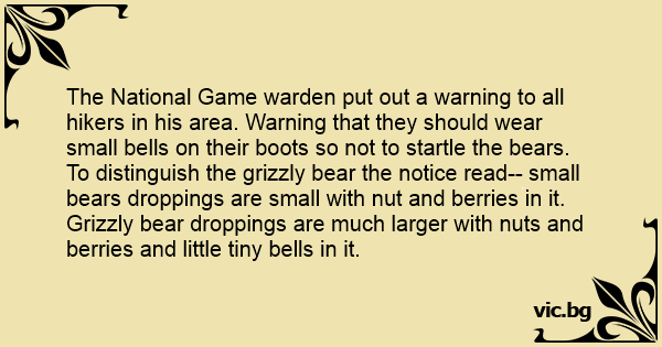 The National Game warden put out a warning to all hikers in his area. Warning that they should wear small bells on their boots so not to startle the bears. To distinguish the grizzly bear the notice read-- small bears droppings are small with nut and berries in it. Grizzly bear droppings are much larger with nuts and berries and little tiny bells in it.