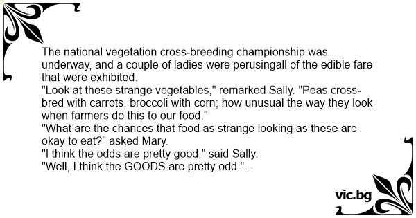 "Look at these strange vegetables," remarked Sally. "Peas cross-bred with carrots, broccoli with corn; how unusual the way they look when farmers do this to our food."
