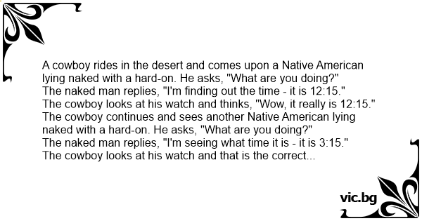 The cowboy continues and sees another Native American lying nакеd with a hard-on. He asks, "What are you doing?"