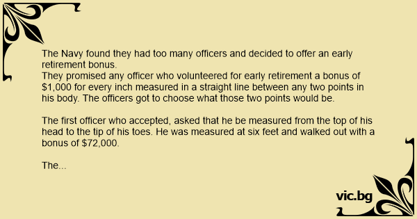 USA’s flotta insåg att man hade för många officerare och beslöt sig för att locka med en avgångsbonus på $1000 för varje tum som man kunde mäta i en rät linje mellan två olika kroppsdelar....