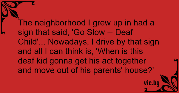 The neighborhood I grew up in had a sign that said, 'Go Slow -- Deaf Child'... Nowadays, I drive by that sign and all I can think is, 'When is this deaf kid gonna get his act together and move out of his parents' house?'