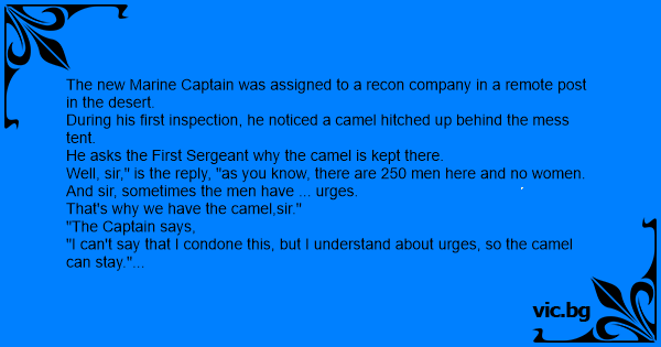La o unitate militara din desert vine un nou comandant. Vazand tipu' o camila legata de un stalp, intreaba ce-i cu ea. - Pai, stiti domn' sef, raspunde unul mai indraznet, cand mai avem novoie de...