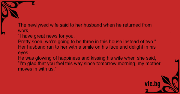 He was glowing of happiness and kissing his wife when she said, “I’m glad that you feel this way since tomorrow morning, my mother moves in with us.”