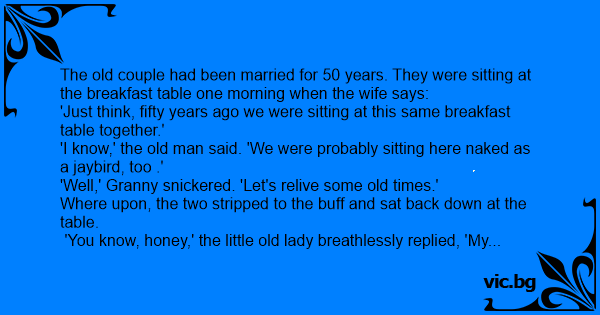 Το ζεύγος παντρεμένο 50 χρόνια. Μια μέρα στο τραπέζι του πρωινού λέει η γιαγιά: - Σκέψου αγάπη μου, πριν 50 χρόνια καθόμασταν σ αυτό το τραπέζι μαζί. - Το ξέρω, απαντάει ο γέρος. Πριν 50 χρόνια καθόμασταν εδώ ολόγυμνοι σαν πιτσουνάκια και απολαμβάναμε το πρωινό μας. - Ας ξαναζήσουμε αγάπη...