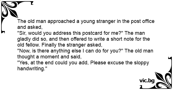 "Sir, would you address this postcard for me?" The man gladly did so, and then offered to write a short note for the old fellow. Finally the stranger asked,