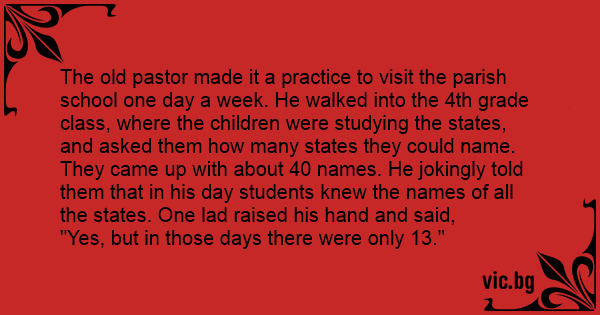 The old pastor made it a practice to visit the parish school one day a week. He walked into the 4th grade class, where the children were studying the states, and asked them how many states they could name.