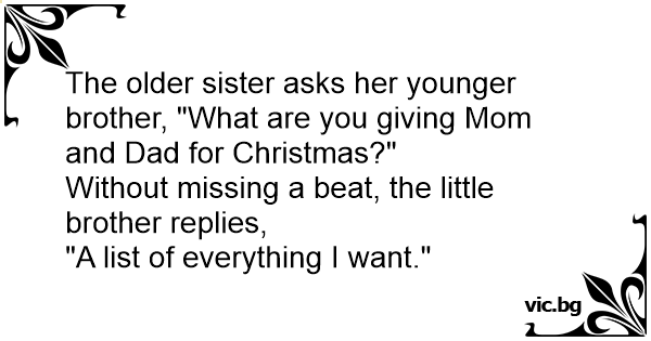 The older sister asks her younger brother, "What are you giving Mom and Dad for Christmas?"