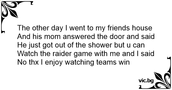 And his mom answered the door and said He just got out of the shower but u can Watch the raider game with me and I said