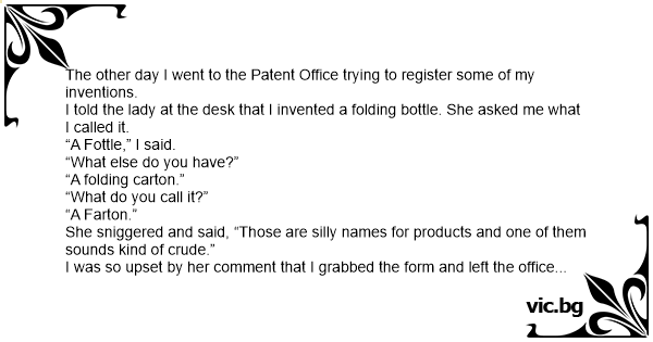 The other day I went to the Patent Office trying to register some of my inventions.